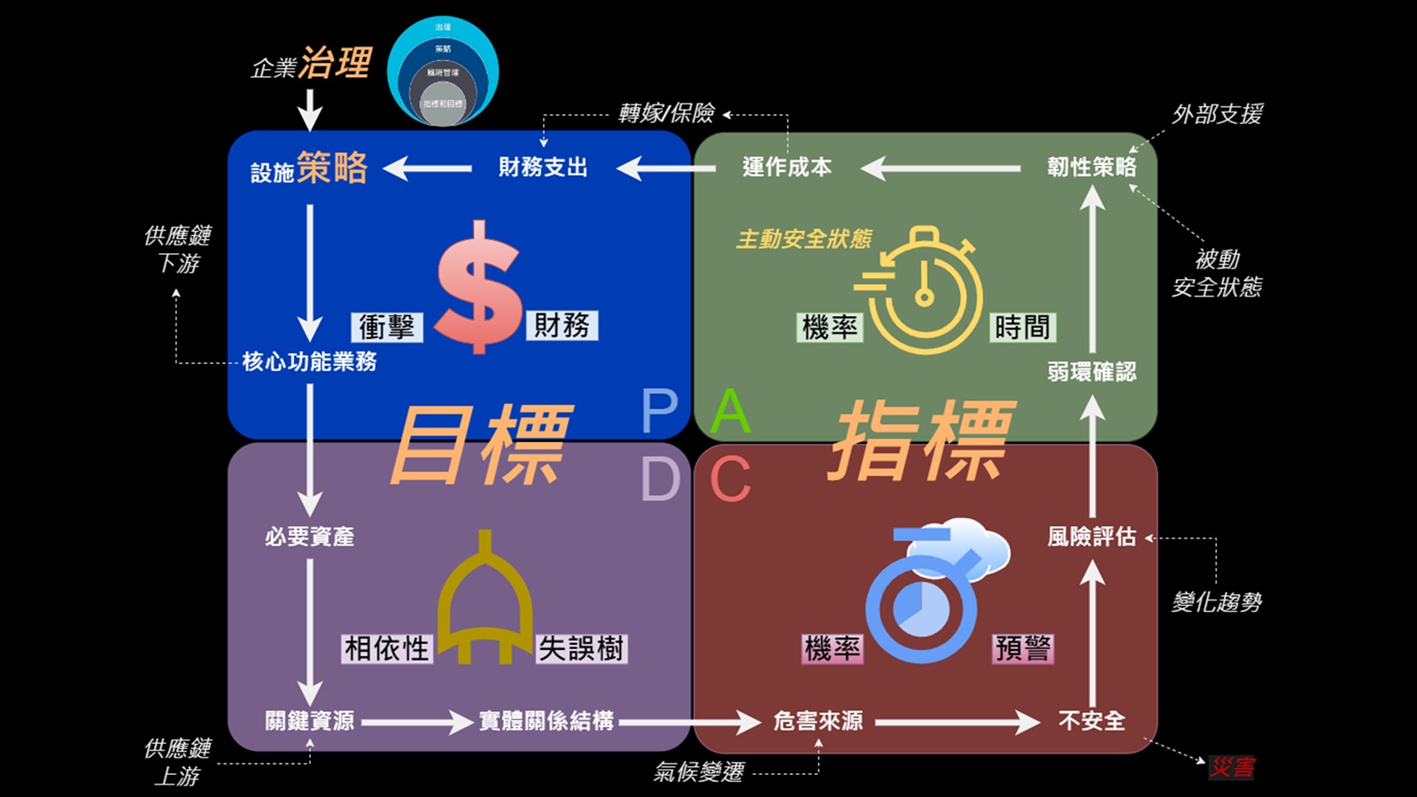 PDCA循環週期以【年】為單位,這樣的運作模式不只符合金管會對於每年企業揭露資訊的要求,對於氣候變遷的評估也是以四季完整循環為基礎進行氣候數據的分析,再結合企業實體的辨識、不安全狀態的確認與校正、風險處置的韌性強化評估、企業財務的資訊整合等,企業可以循序漸進評估與改善風險,檢視不同層次的風險管理議題,因此也完全對應品質管理的Plan-Do-Check-Action的完整循環,相信熟知風險管理與品質管理的讀者應能理解。