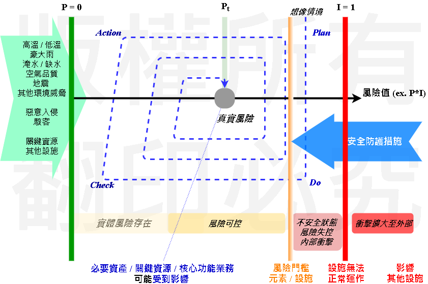 在上面【實體風險 與 設施安全 關係與示例】這張圖中,固然真實風險一定存在,真實風險的位置其實並不重要,甚至包含判斷它位置(機率Pt)的精度也不重要,因為它時時刻刻都在改變,但是有一件事情非常重要:確定真實風險的發生機率不能超出黃線甚至紅線,因為這代表企業或設施進入不安全狀態與營運中斷可能發生,因此在TCFD實體風險的分析上,進入【不安全狀態的判斷標準】遠比【氣候資料的精度】重要,而這個標準取決於企業對風險的態度,也影響安全防護措施如何運作,所謂安全防護措施也包括營運持續計畫(BCP)的標準作業程序(SOP)。