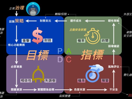 - 企業不太可能接觸【國家關鍵基礎設施】的理論,也沒有專家針對TCFD實體風險的責任加以釐清,因此筆者也寫了安全程度 V.S. TCFD實體風險與設施安全防護這篇文章,試著協助企業釐清【主動安全狀態】與【被動安全狀態】在概念上的關係,也只能是概念上的關係,因為它會隨著實體、危害、情境等條件不同而產生差異。