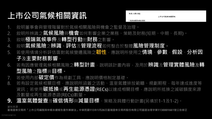 根據這個特性,TCFD建議實體風險分析方式以【量化情境分析】為主,同時情境、參數、假設、分析因子及主要財務影響等都必須要說明,這些要求也反映在【上市公司編製與申報永續報告書作業辦法】中。