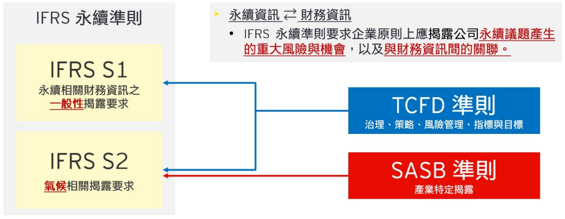 - TCFD 建議的管理架構全面應用於 IFRS 內容,並非僅侷限在 IFRS S2,同時反映於法規要求中。