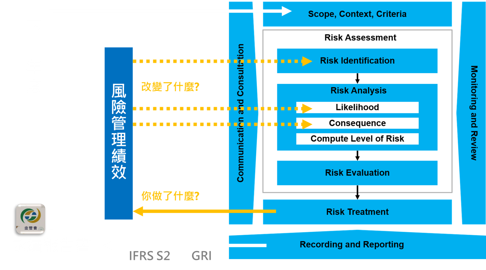無論是 IFRS 和當前對於永續報告書的法規要求,執行的核心觀念在於風險管理及它的績效指標,包含風險與機會。結合永續與2050年淨零目標的概念,它不僅包含短、中、長期的時間考量,更包含風險管理的PDCA持續精進的紀錄。