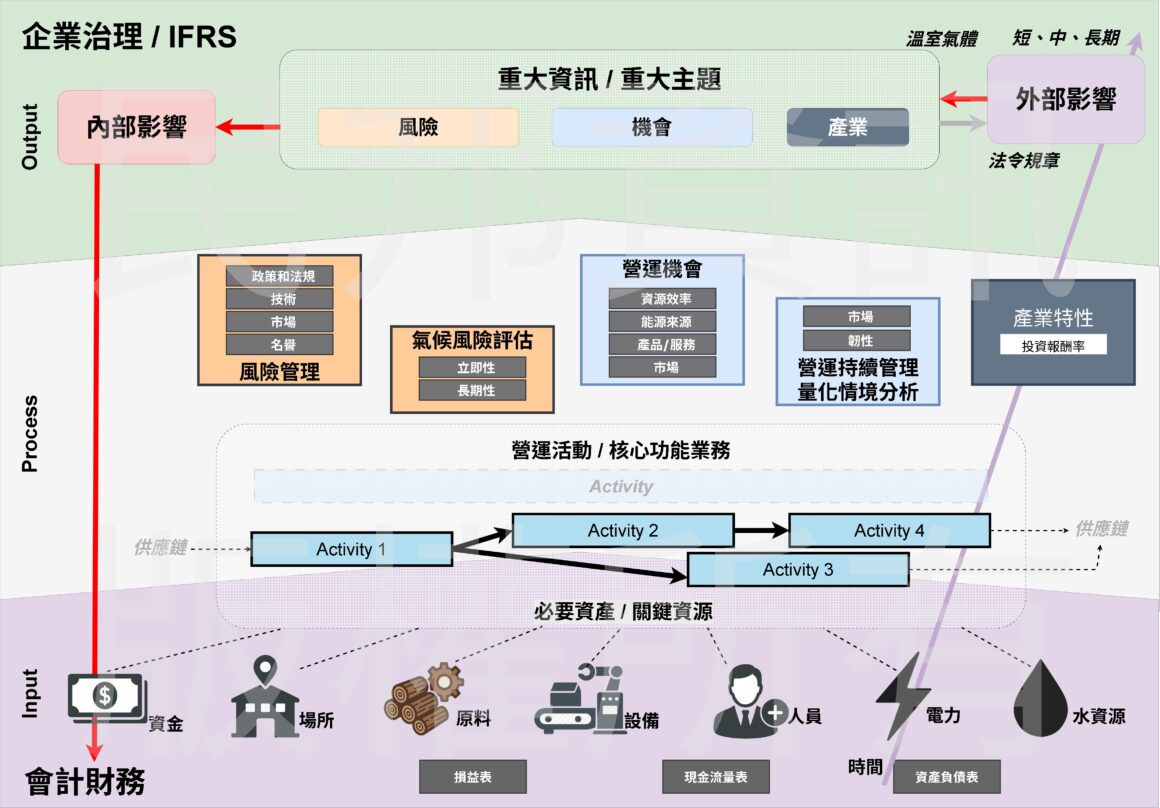 ESG 看似龐雜是基於GRI與涉及法規的基本需求,實際上的企業管理重點和永續報告書圍繞在【重大主題】的績效,而決定重大主題管理績效的則是企業核心營運活動與支持它運作的實體(人、機、料、水、電、財務等)。